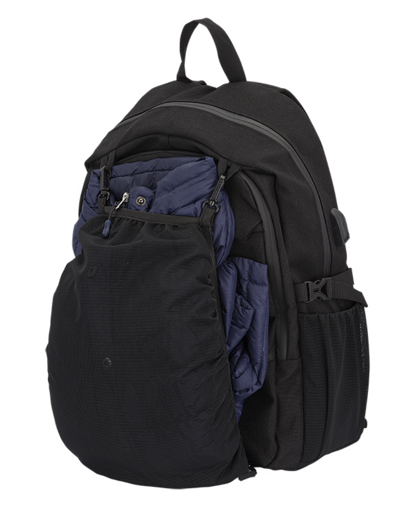 - Hidden front-bottom zippered compartment holds cargo mesh with clips – easily holds a